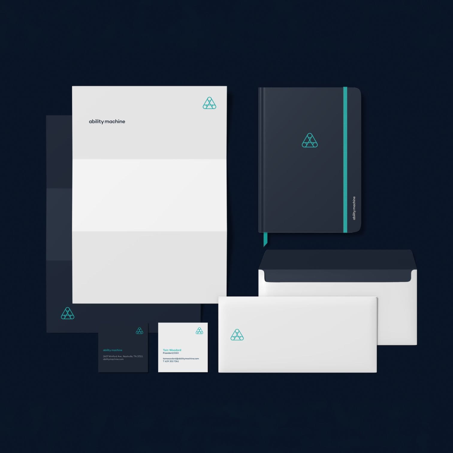 The Ability Machine logo was designed to convey the ideas of growth, connection, and balance. The triangular form is meant to subtly evoke the idea of the Holy Trinity while simultaneously conveying the notions of strength and stability. The interconnected shapes illustrate the relationship between thinking, creation, thriving and collaboration. Together, these elements reinforce the agency’s mission to create pathways for neurodivergent talent to grow, express ideas, and find their place in the creative world.