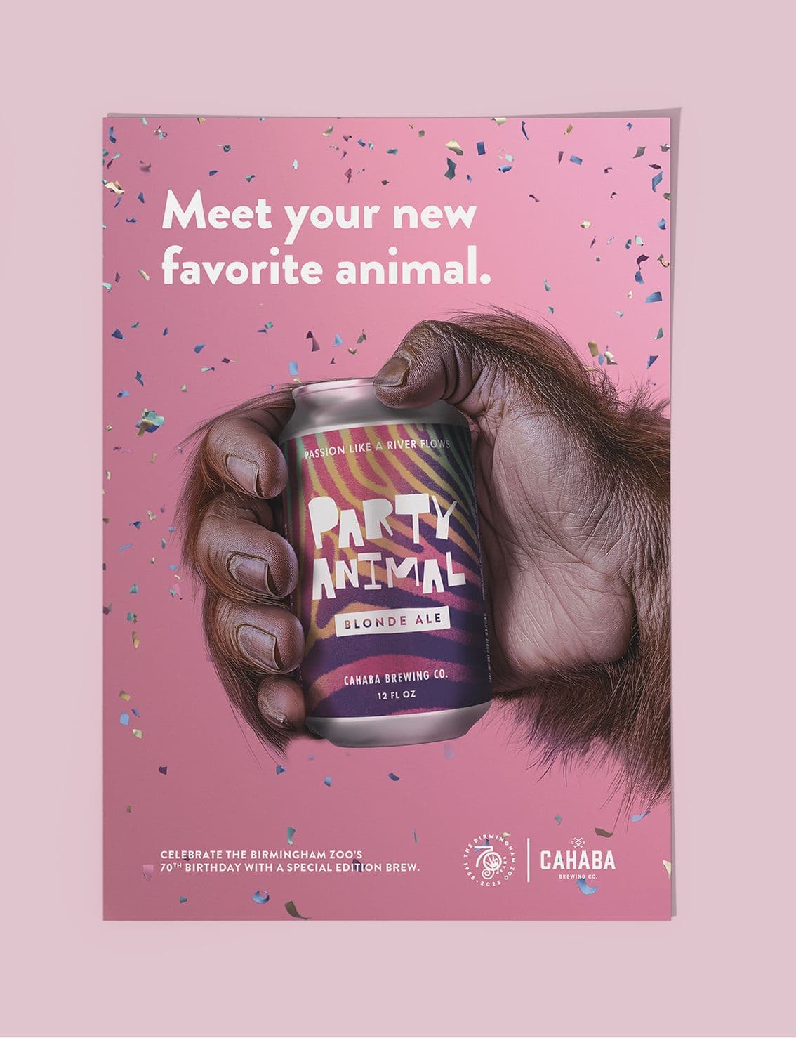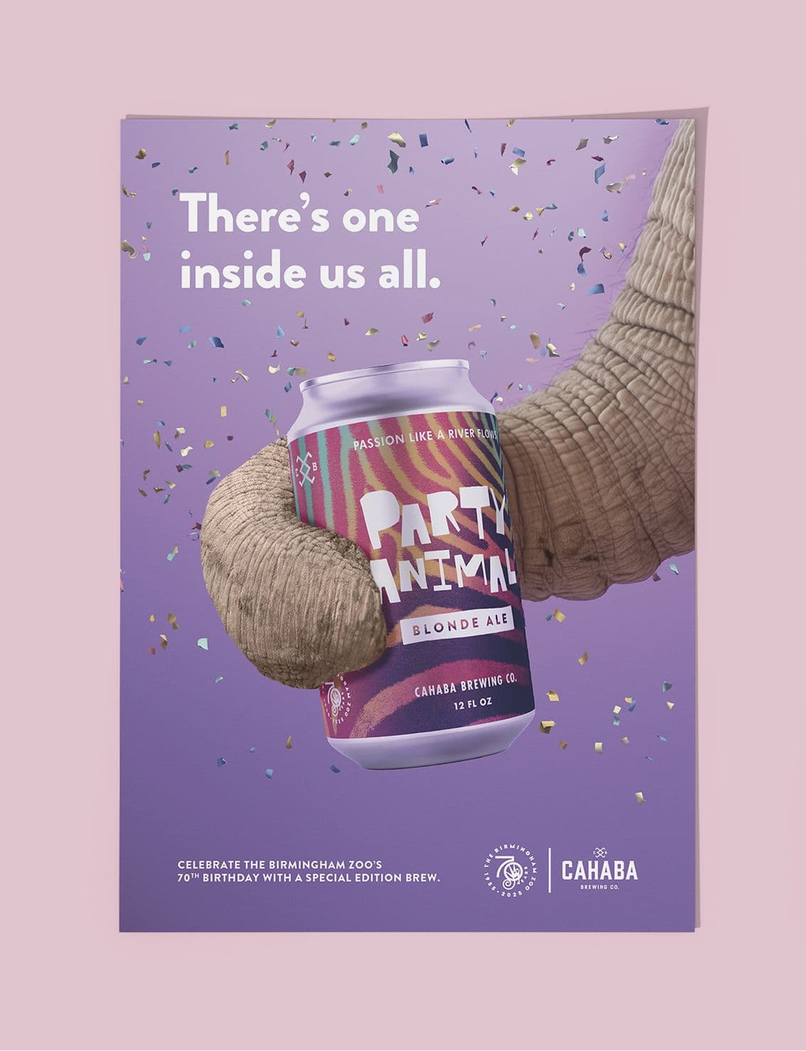 The party continued all year, and when the annual "Zoo Brews" event arrived, we partnered with Cahaba Brewing Co. to create custom Blonde Ale and Hazy IPA designs. The perfect drinks to raise a toast to 70 years of wild.