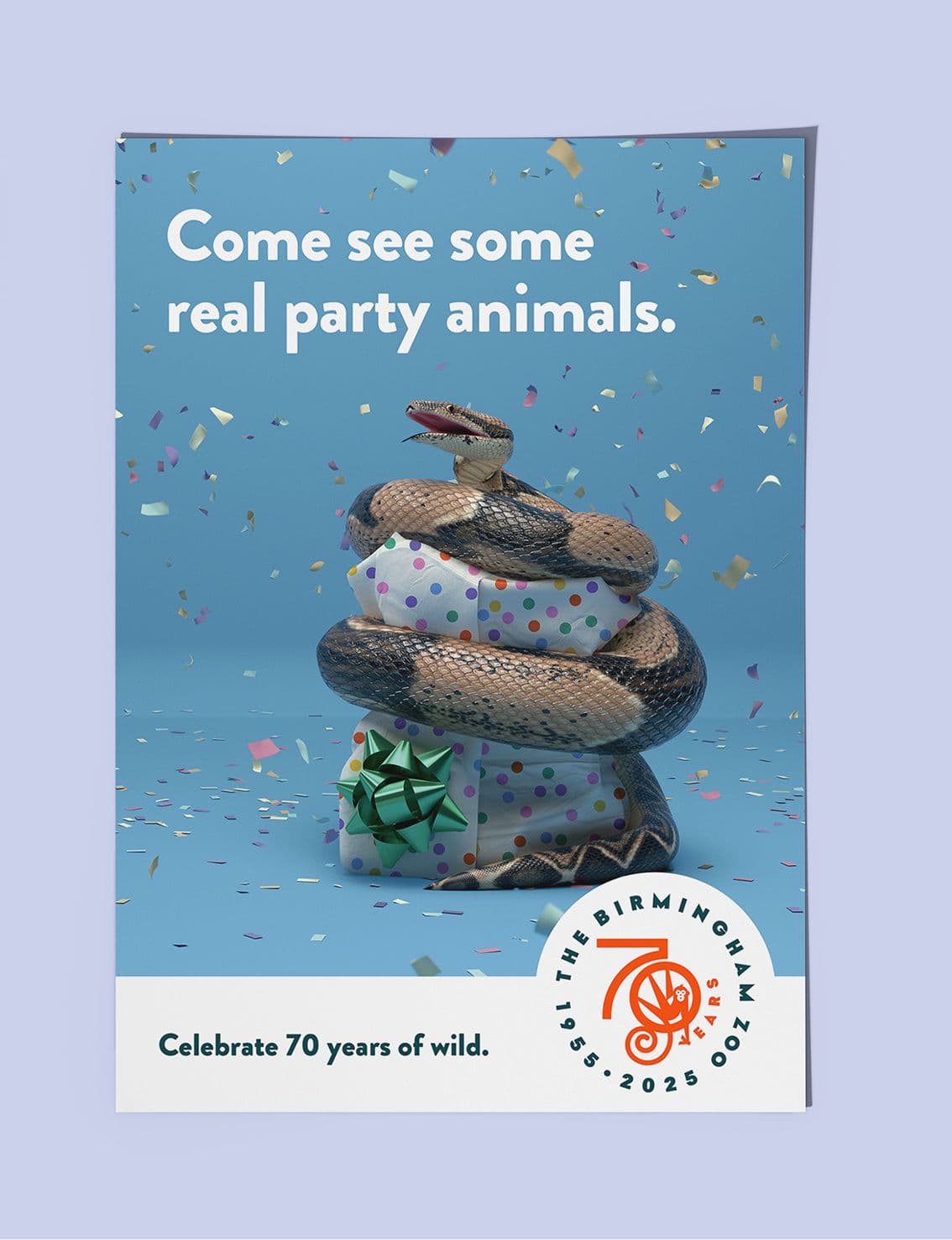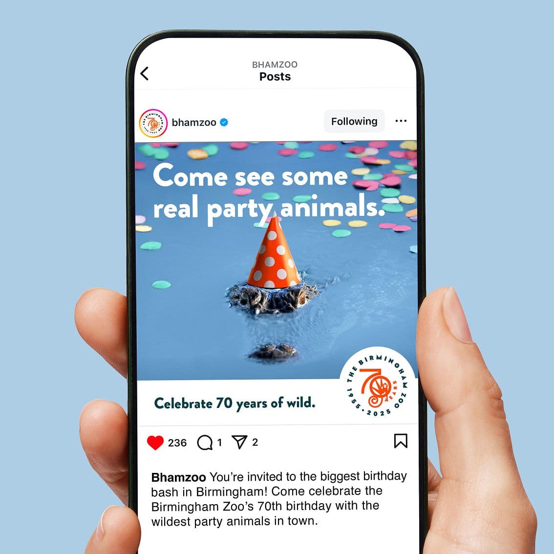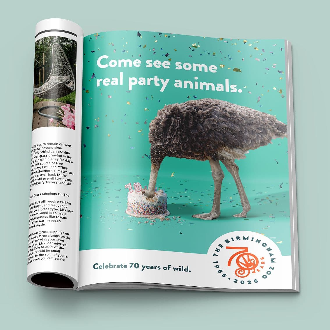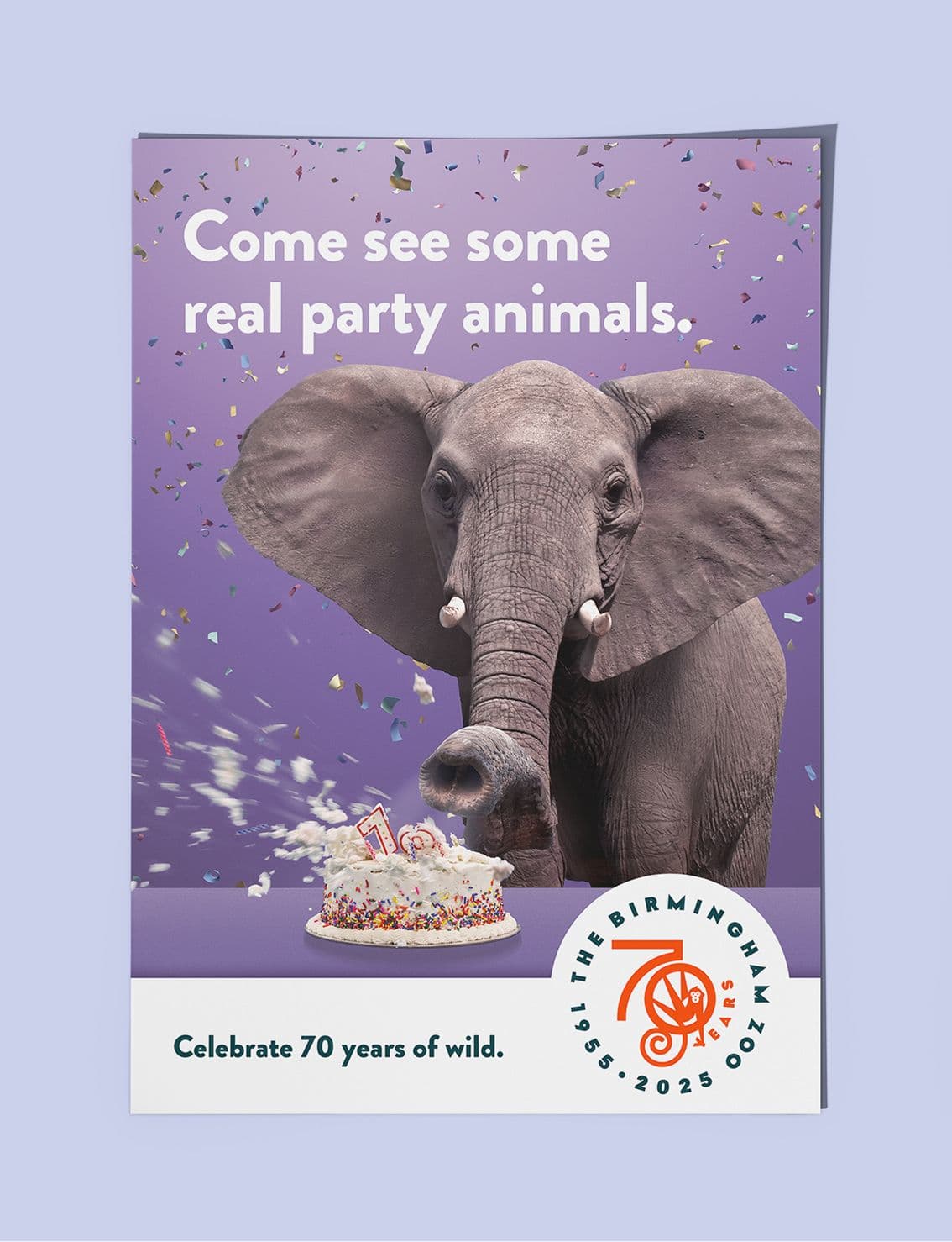 The Birmingham Zoo came to us with a simple ask–create a logo mark for their 70th anniversary. What they ended up getting was a year-long integrated campaign celebrating the biggest birthday in Birmingham and inviting everyone to get in touch with their inner party animal.