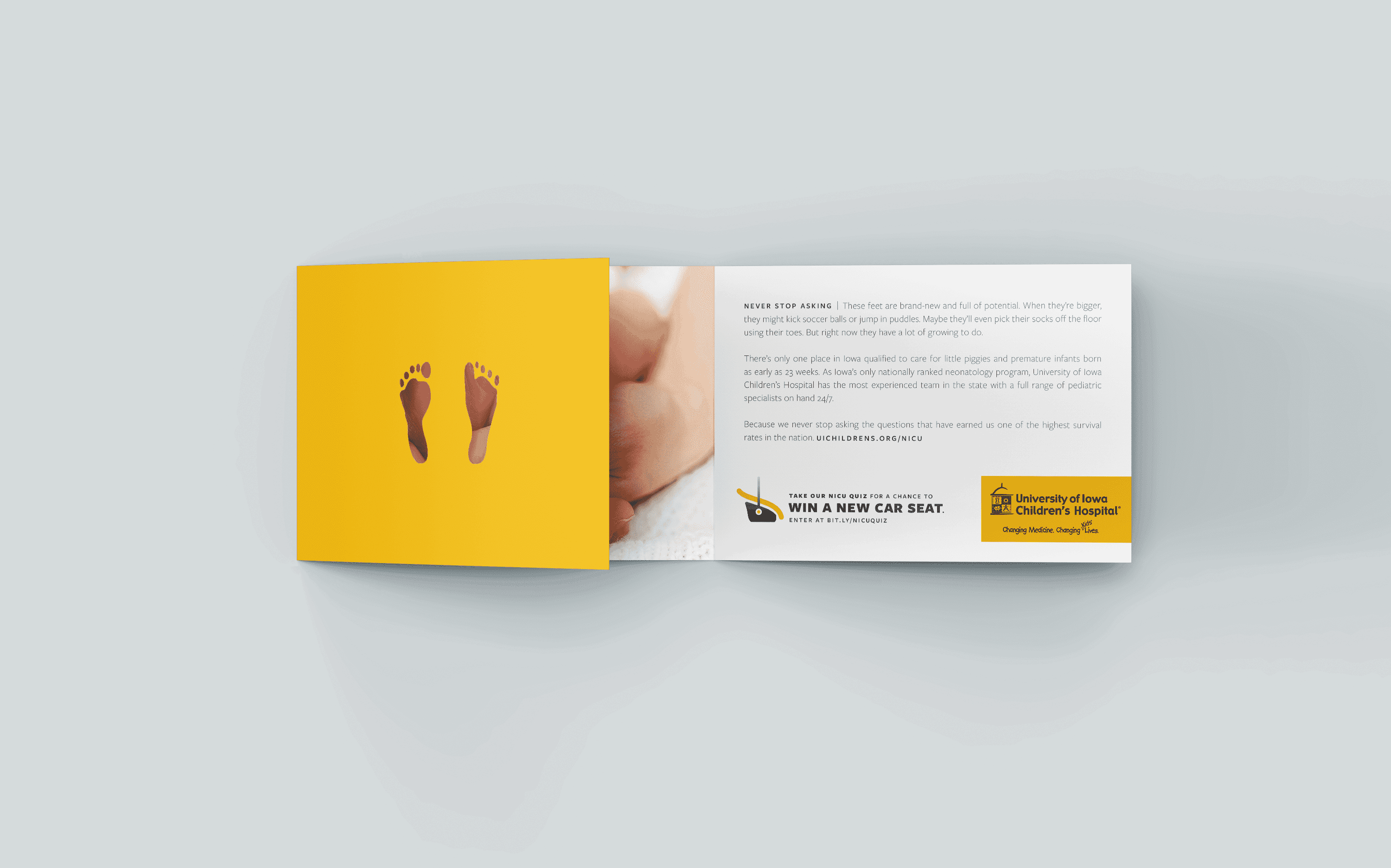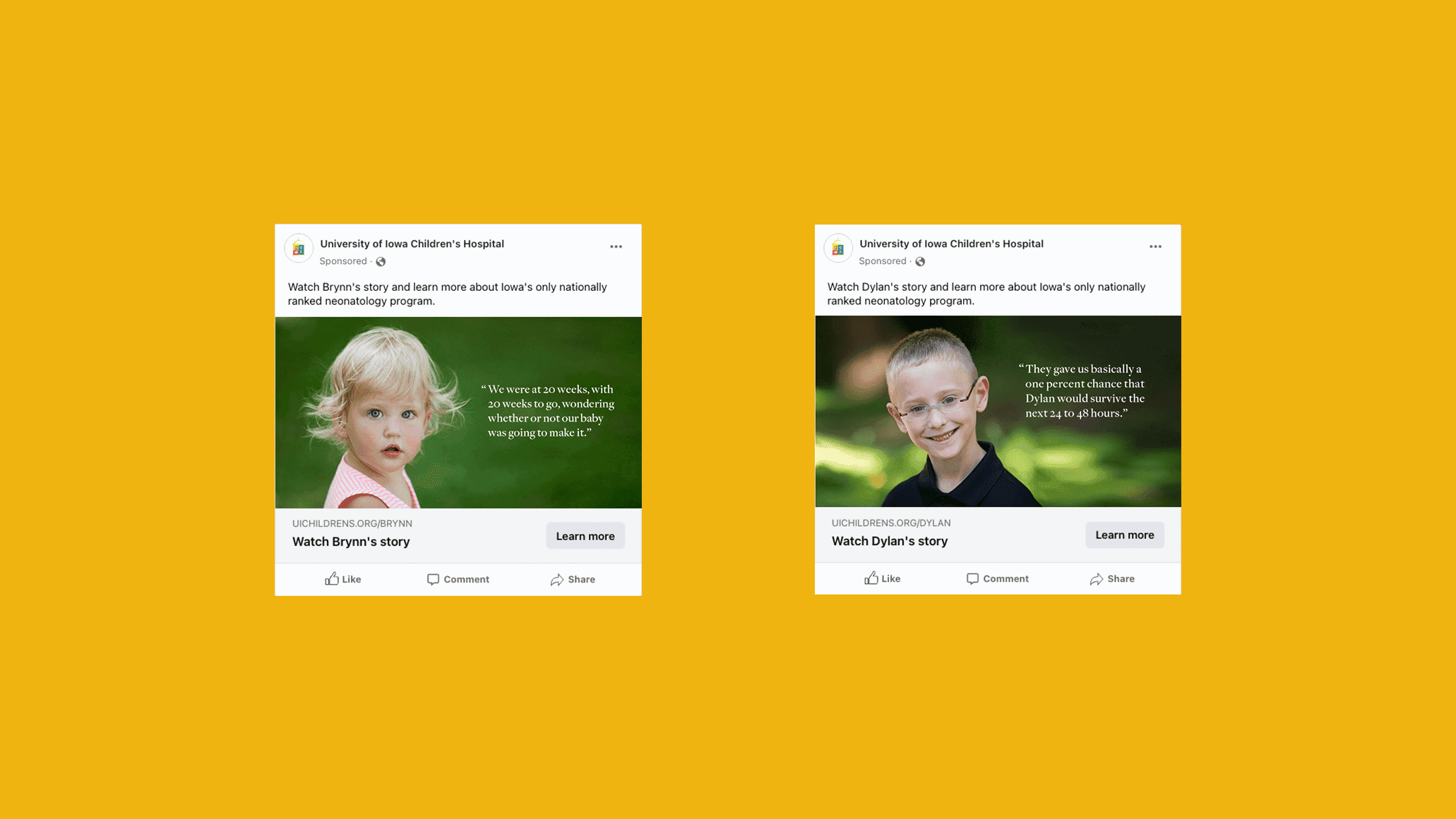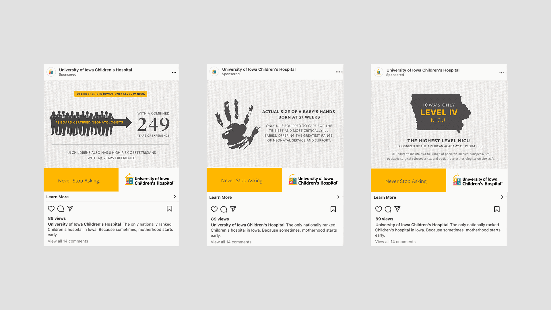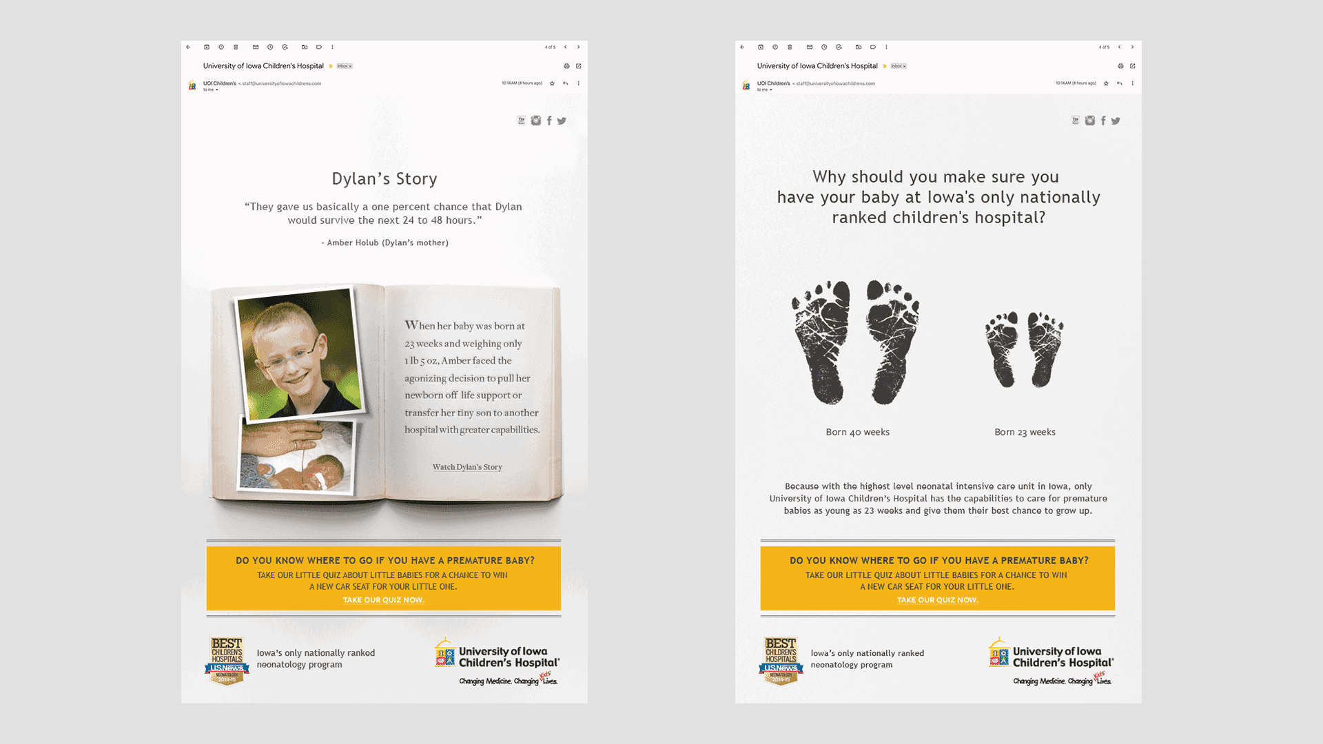 The technical differences between a level 4 NICU and a level 3, 2 or 1 may be many, but what really matters is that a level 4 gives even the tiniest babies the best chance of a healthy life. Utilizing a mix of heart-warming stories and simple-to-understand educational information, we gave birth to a fully-integrated campaign to ensure current and future moms know the difference Iowa's only level 4 NICU can make for their baby.