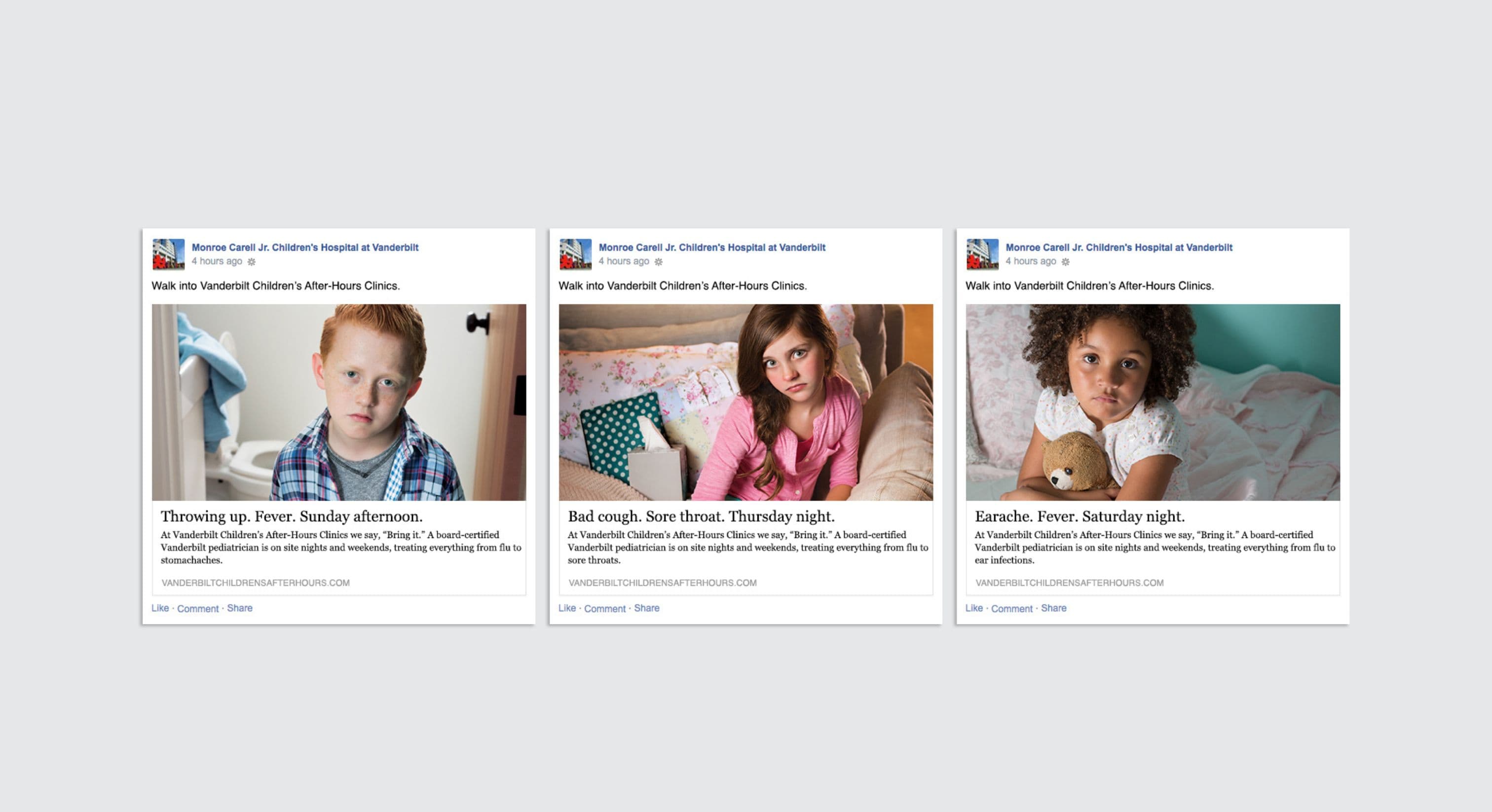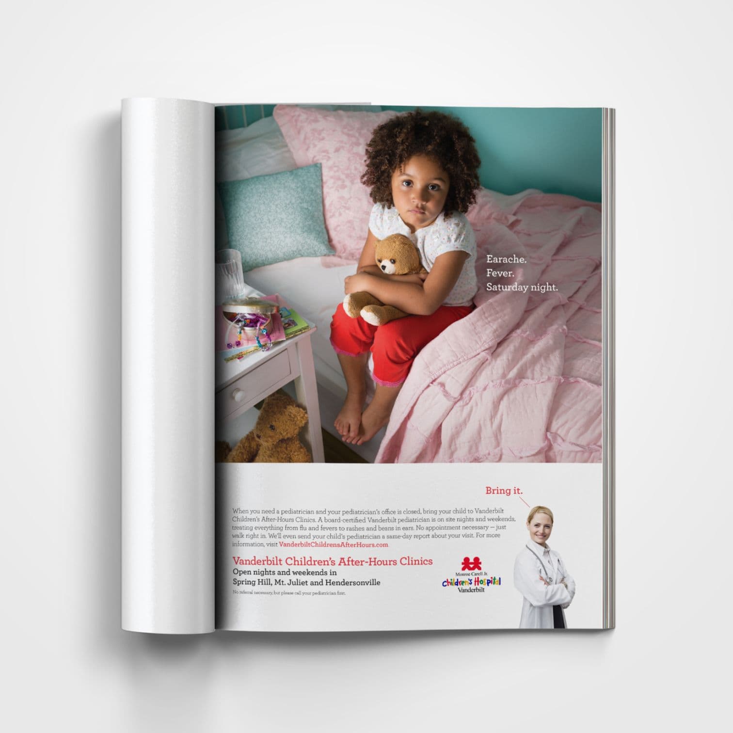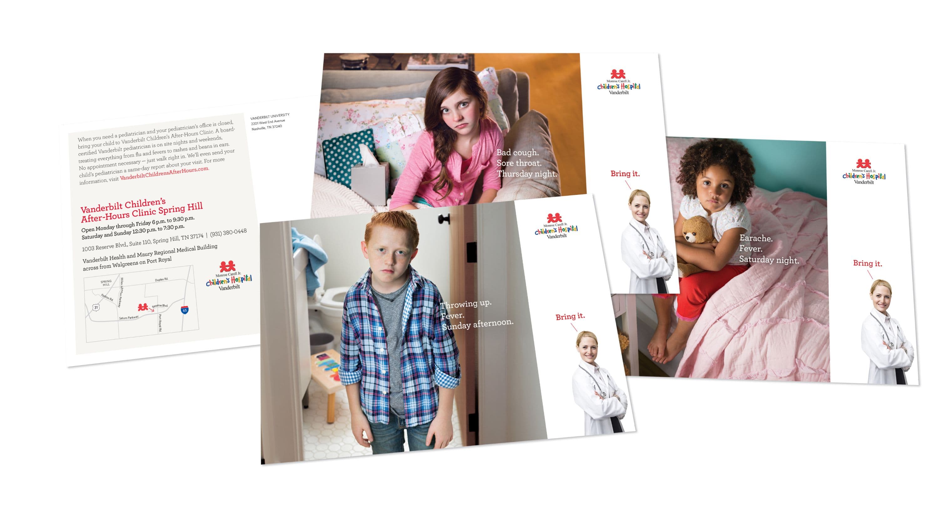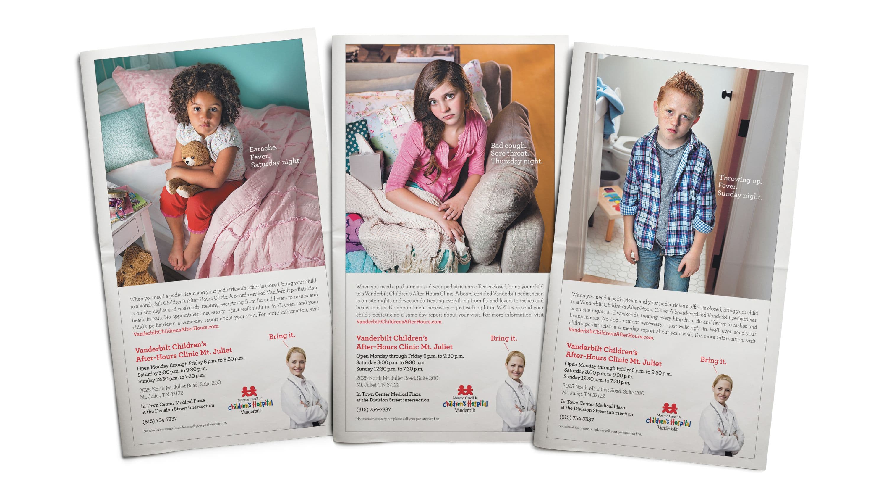 Monroe Carell Jr. Children's Hospital at Vanderbilt knows the drill: kids wait until dinner's on the stove or pajamas are on before coming down with something. That's why they created Vanderbilt Children's After-Hours Clinics – open nights and weekends, no appointment needed, and staffed by real Vanderbilt pediatricians who can handle everything from sniffles to stuck beans in ears. This campaign leans into that all-too-familiar moment – when the clock strikes six and your child spikes a fever – and reassures parents with a simple, confident promise: bring it.